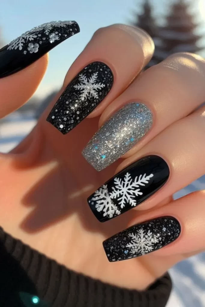 3. Uñas negras con copos de nieve y detalles de purpurina plateada.