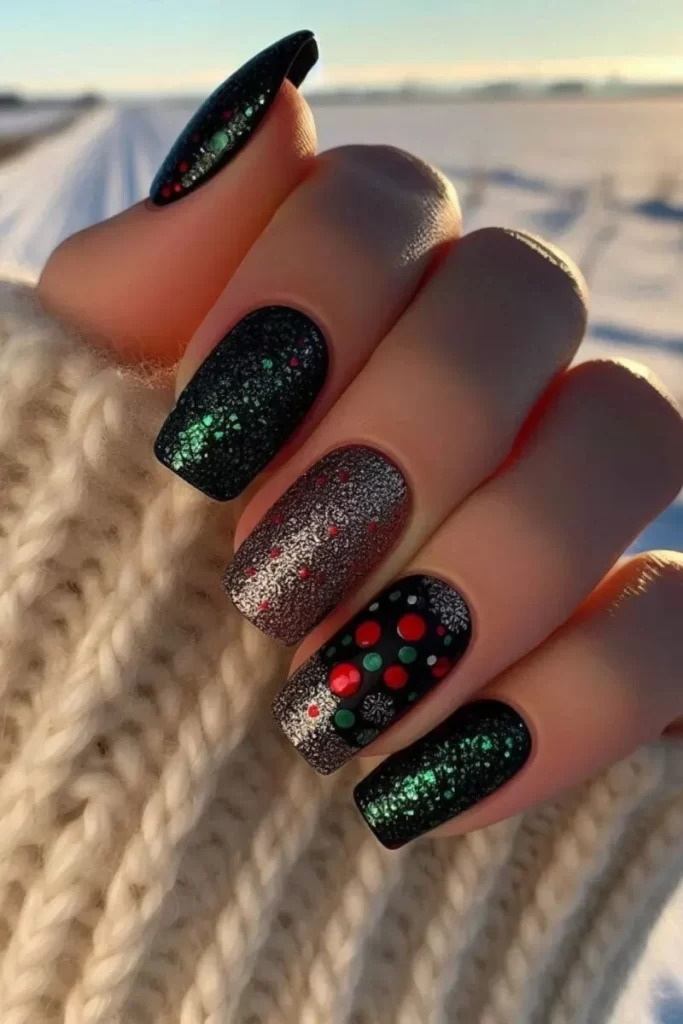 Este diseño presenta una base negra adornada con vibrantes lunares rojos y verdes, complementados con detalles de purpurina verde y plateada. La combinación de colores vibrantes y purpurina brillante crea un look divertido y festivo, perfecto para celebraciones navideñas.