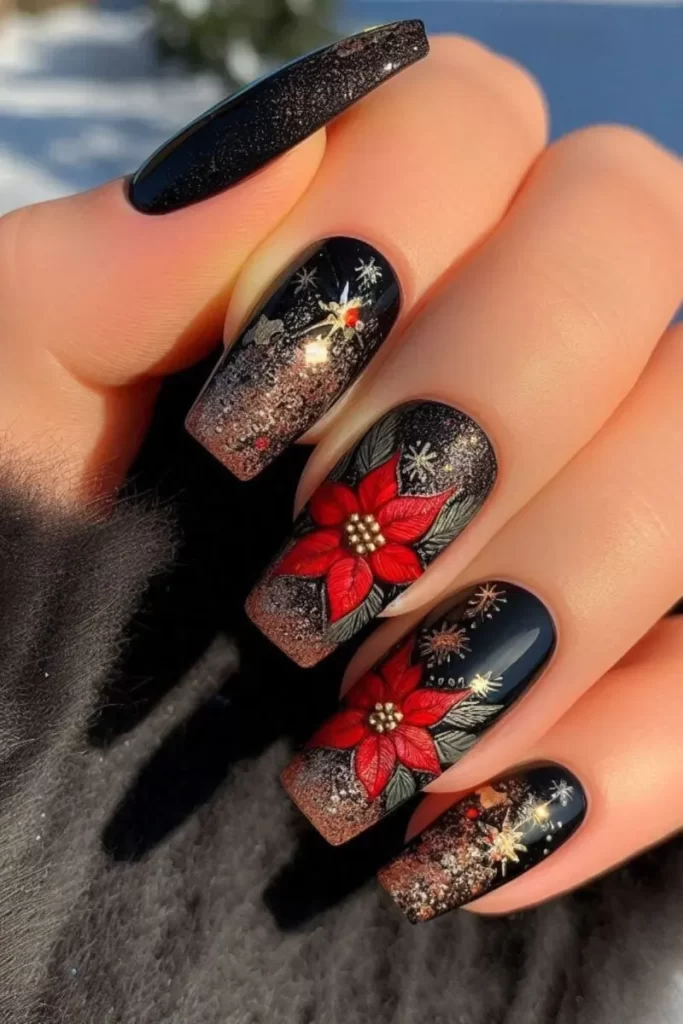 7. Uñas negras con flor de Pascua roja y dorada