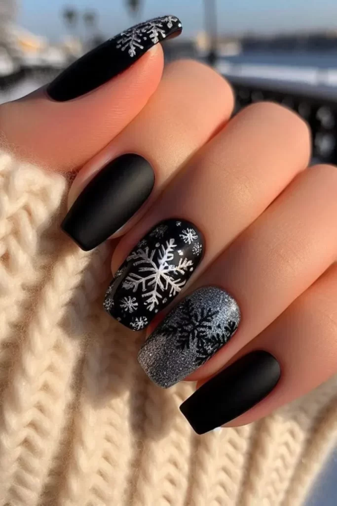 9. Uñas negras mate con copos de nieve y purpurina